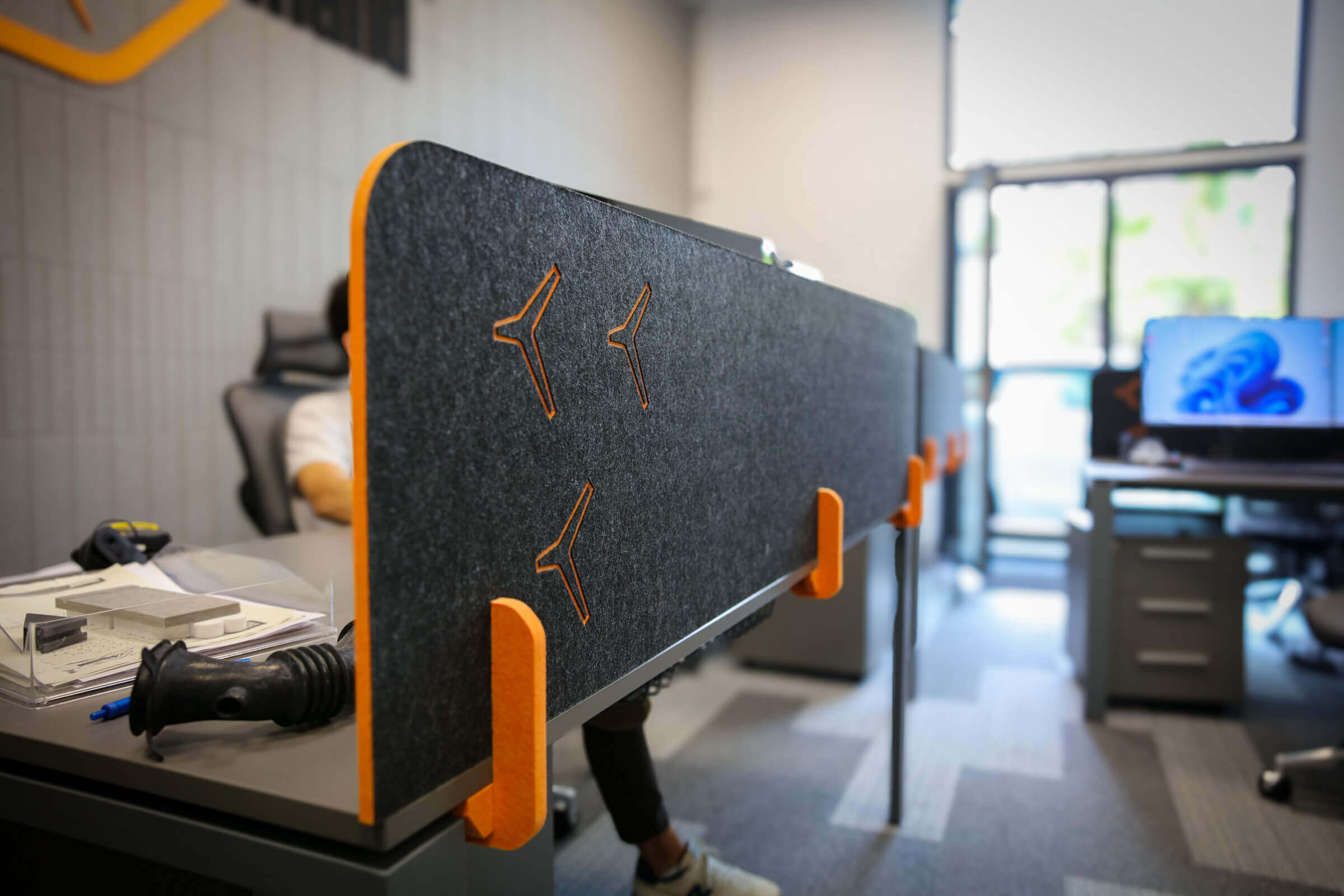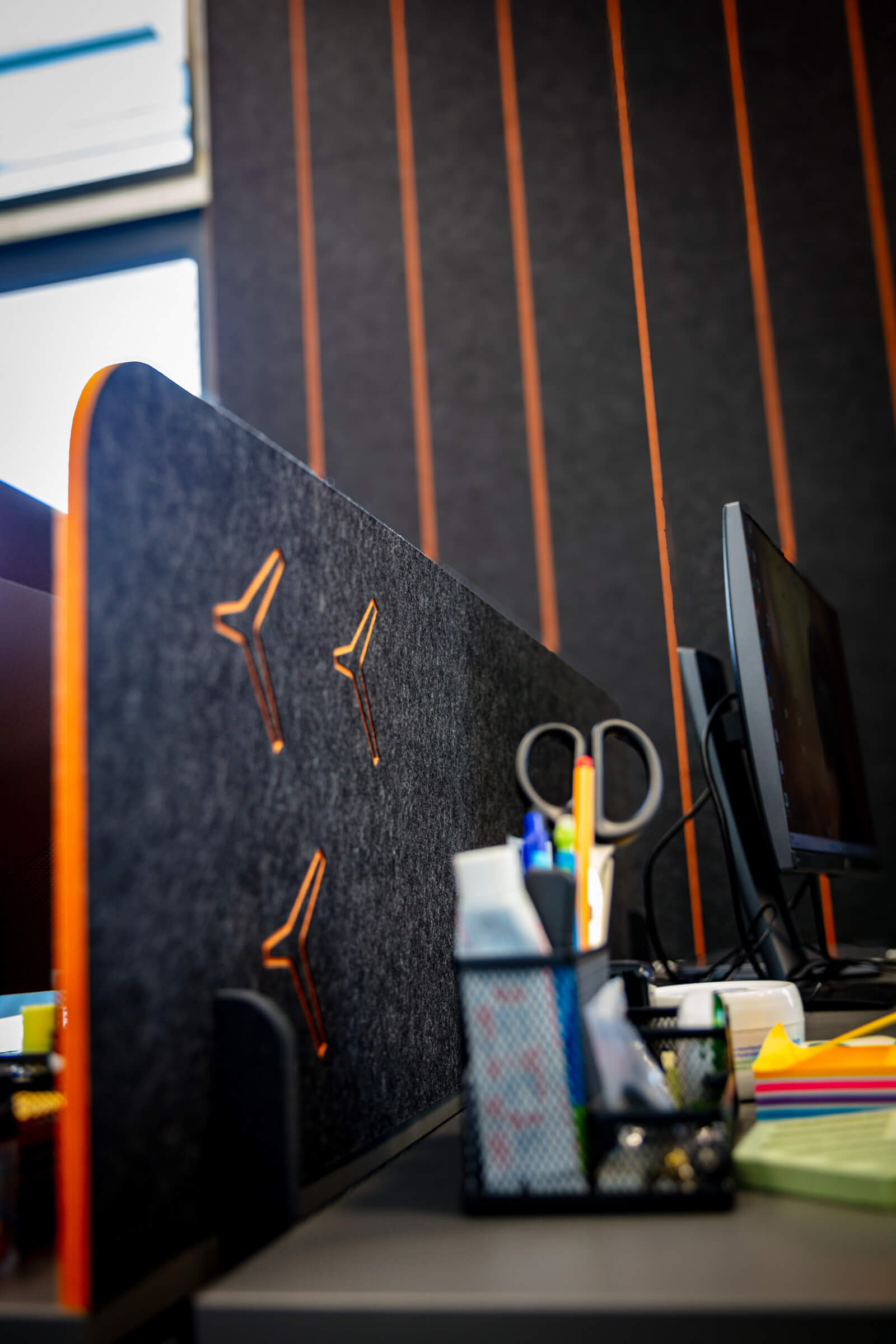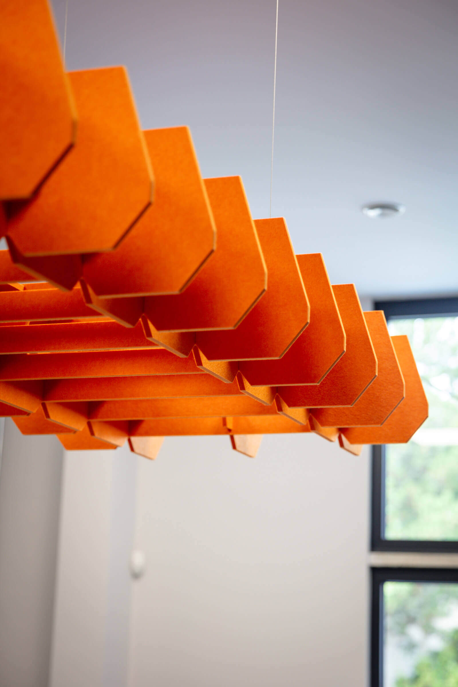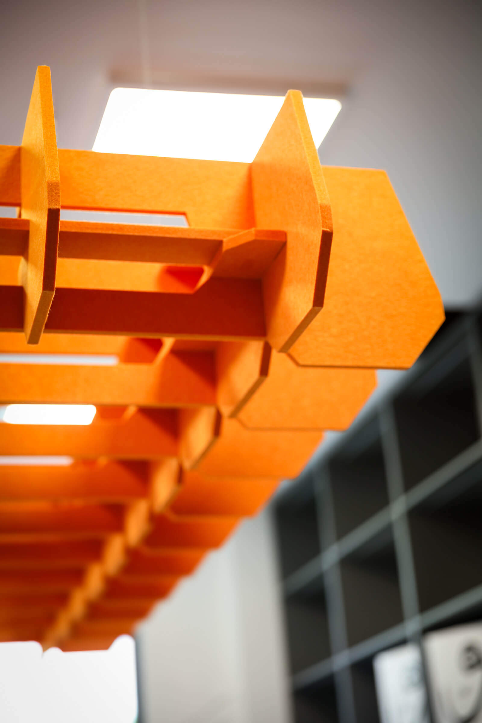 Our solution was a multi-faceted approach, centered around our signature WallAttract acoustic felt panels. These panels were strategically placed throughout the offices to significantly reduce echo and unwanted noise, creating a more comfortable and focused environment for everyone. To elevate the visual identity, we crafted a custom 3D felt logo that immediately draws the eye and reinforces the 3Demand brand. We extended this bespoke design to other elements, including custom-cut felt desk dividers and a unique, custom-designed felt lampshade. The lampshade, a focal point of the meeting room, was meticulously crafted to contribute to the room’s acoustic quality while adding a distinct, personalized touch that truly sets the space apart.