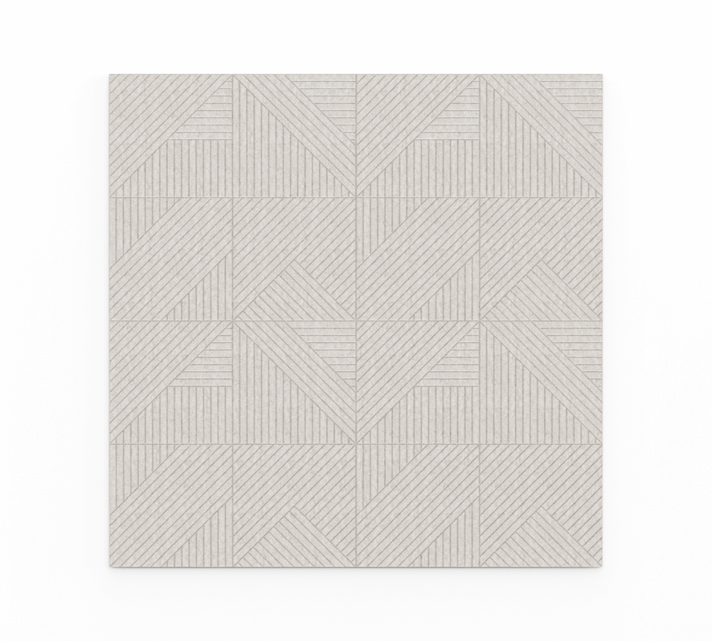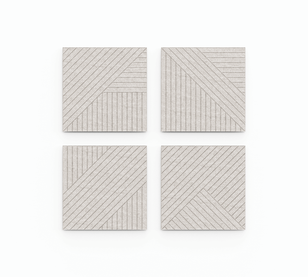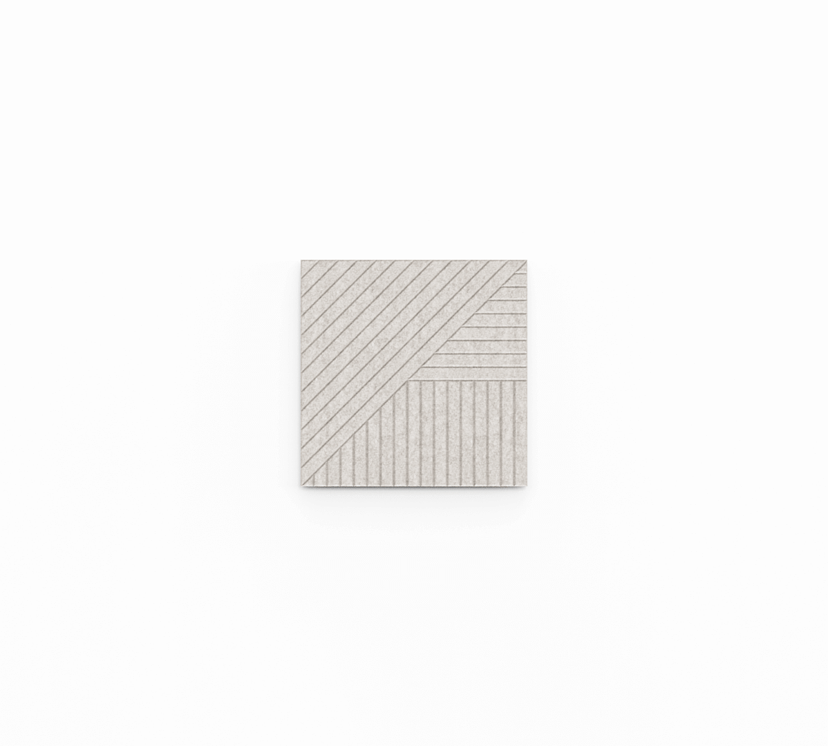 Slant Acoustic Wall Panels are 60×60 cm modern acoustic panels featuring a bold composition of straight and diagonal groove lines. Inspired by architectural grids and abstract geometry, the pattern creates dynamic intersections of triangles and trapezoids formed by fine parallel grooves.