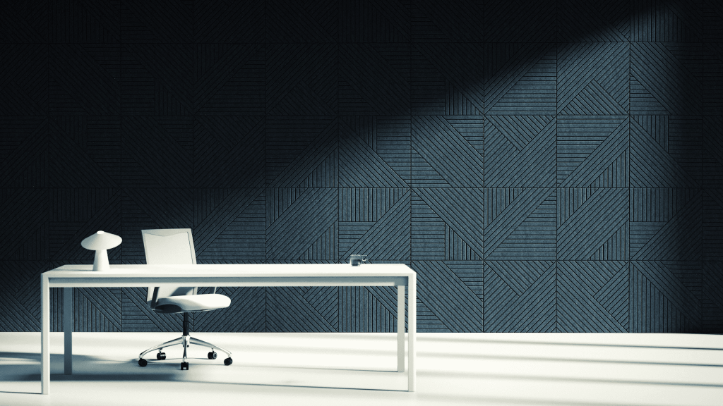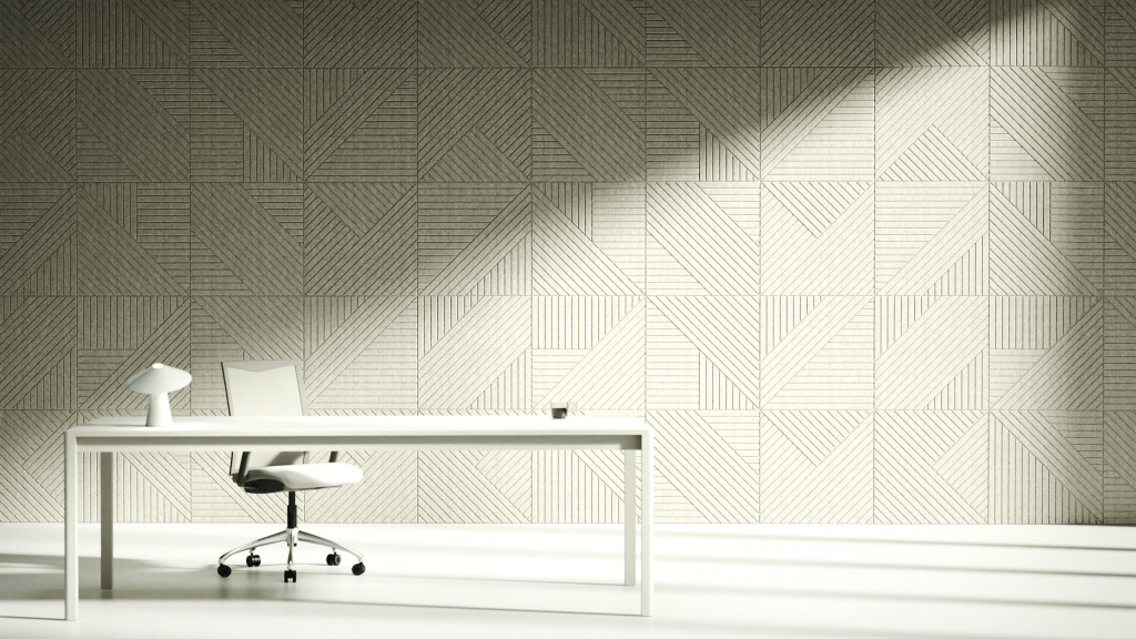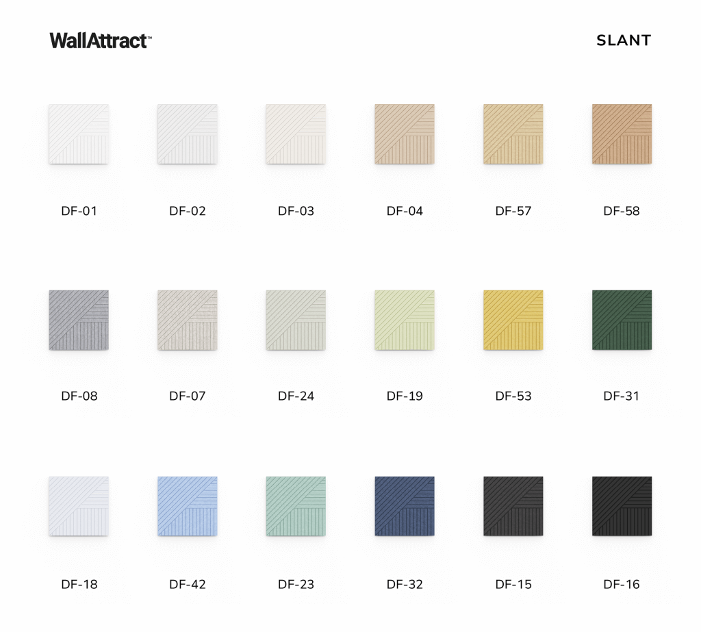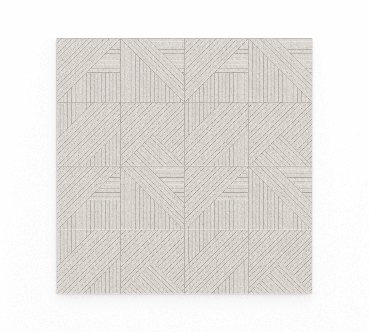 Slant Acoustic Wall Panels are 60×60 cm modern acoustic panels featuring a bold composition of straight and diagonal groove lines. Inspired by architectural grids and abstract geometry, the pattern creates dynamic intersections of triangles and trapezoids formed by fine parallel grooves.