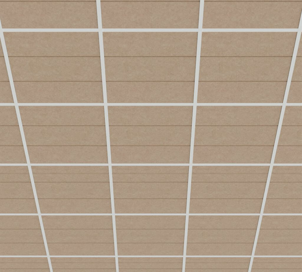 This variant features precisely milled V-shaped grooves that create visual rhythm and depth. The subtle geometry brings texture to the ceiling without disrupting its balance.